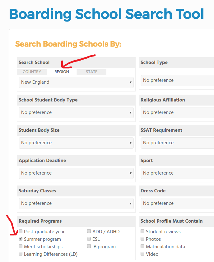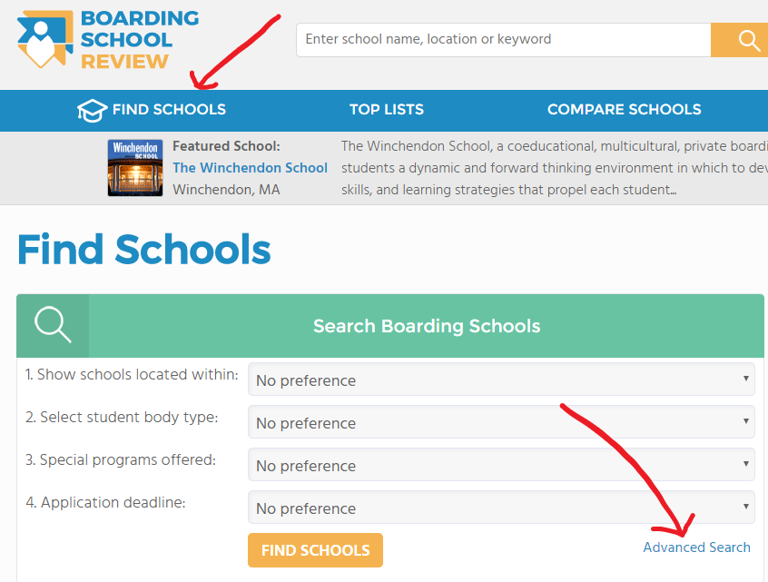 Searching for summer programs is easy on Boarding School Review. From our home page click on Find Schools. Then click on Advanced Search. Select the region and check the box at the bottom left of the screen for Summer Program.